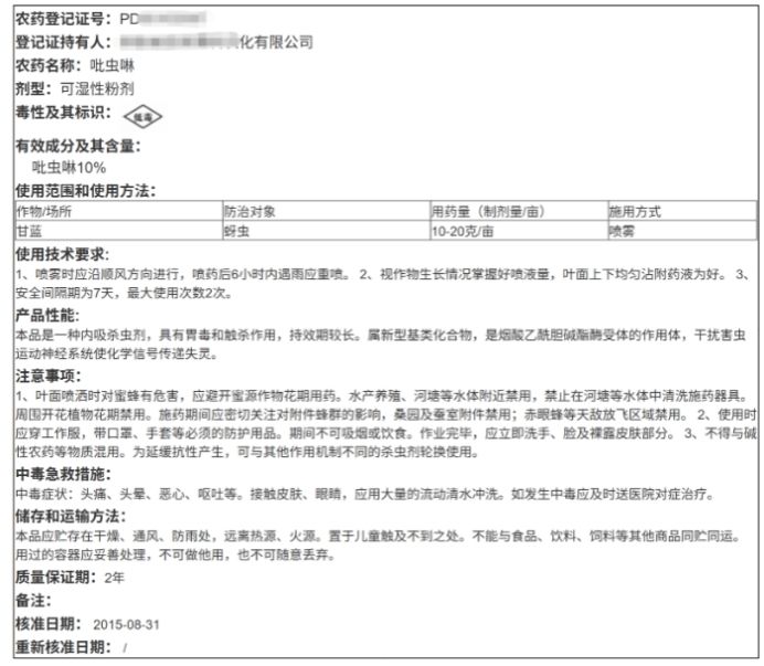 例如上图中这个农药,10%吡虫啉可湿性粉剂,在甘蓝上的安全间隔期是7天。这就表示,使用这种农药防治甘蓝上的蚜虫时,用药量不超过标签上标示的最大用药量(20克制剂/亩),最多使用次数不超过2次的情况下,用药7天之后,就可以放心采摘了。