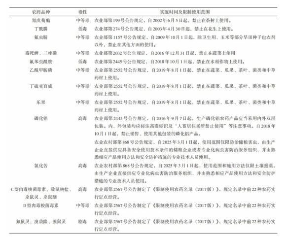 法律规制上,1997年,国务院颁布《农药管理条例》,明确规定剧毒、高毒农药不得用于防治卫生害虫,不得用于蔬菜、瓜果、茶叶和中草药材,使禁限用农药管理工作步入了规范化、法制化的轨道。该条例经过2017年、2022年2次修订,对禁限用农药的生产、使用等做了更为全面的规定和指导。此外,2021年修订的《中华人民共和国食品安全法》和2022年修订的《中华人民共和国农产品质量安全法》有关条款,对禁限用农药等农用投入品的使用做出严格的规定,包括严格执行农业投入品使用安全间隔期或者休药期的规定,禁止将剧毒、高毒农药用于蔬菜、瓜果、茶叶和中草药材等国家规定的农作物,禁止在农产品生产经营过程中使用国家禁止使用的农业投入品以及其他有毒有害物质等相关内容。