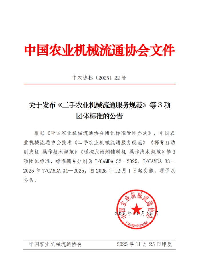 根据《中国农业机械流通协会团体标准管理办法》,中国农业机械流通协会批准《二手农业机械流通服务规范》《椰青自动削皮机 操作技术规范》《遥控式蚯蚓铺料机 操作技术规范》等3项团体标准,自2025年12月1日起实施,现予以公告。